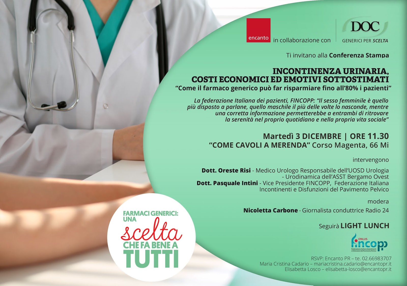 A dicembre incontro stampa a tema farmaceutico con DOC Generici: martedì 3 Encanto organizza una conferenza stampa, il cui argomento sarà l’incontinenza urinaria e i suoi effetti collaterali sulla vita di chi ne soffre ed il ruolo fondamentale che può assumere il farmaco generico. L’evento si svolgerà a Milano da “Come cavoli a merenda” in Corso Magenta, 66, alle ore 11.30.